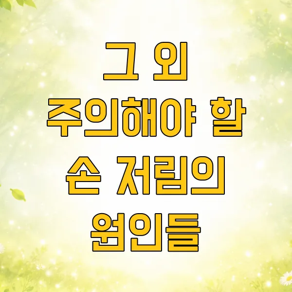 손 저림은 앞서 말씀드린 원인들 외에도 다양한 질환의 신호일 수 있어 주의가 필요해요. 당뇨병성 신경병증은 당뇨병 환자에게서 흔히 나타나며, 손발이 저리고 시린 증상을 유발할 수 있습니다. 또한, 갑상선 기능 저하증이나 류마티스 관절염 같은 내과적 질환도 손 저림과 관련이 있을 수 있고요.